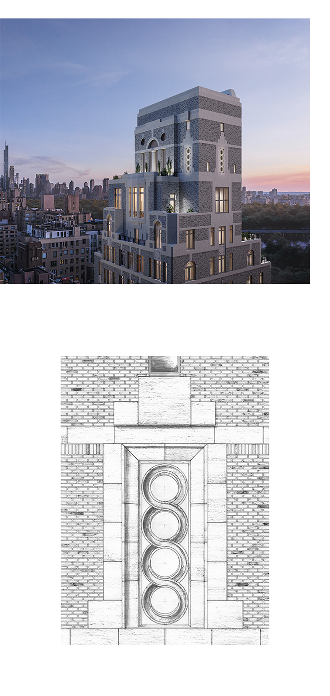 Robert A.M. Stern Architects has designed a highly nuanced, boutique scale, exclusive residential building consisting of 13 private full-floor, duplex and triples homes. 1228 Madison Avenue marks the return of elegant, confident architecture to the Upper East Side, enhanced for the 21st century. Deeply rooted in Classical architecture, the richly detailed façade comprised of shot-sawn limestone and heathered brick rises one block from the Guggenheim Museum and Central Park and is surrounded by the best services and shops only Madison Avenue can offer. Grand living rooms and private terraces enjoy spectacular light and views, some of which include Central Park, the Jacqueline Kennedy Onassis Reservoir, and the iconic Central Park West skyline.